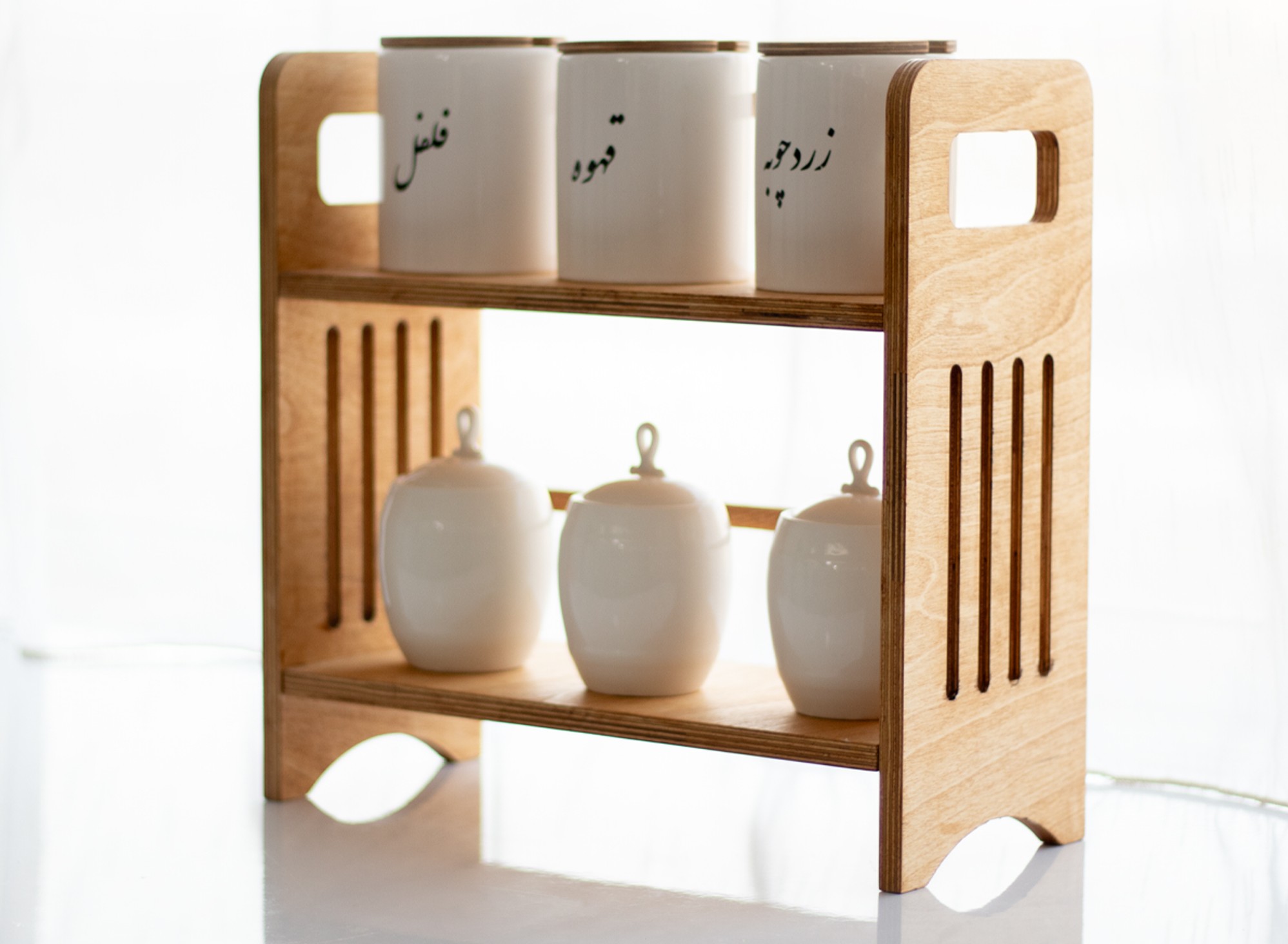 طراحی دو طبقهی ونوس به شما امکان میدهد ظروف ادویه، بطریهای روغن، سس و سایر اقلام پرکاربرد آشپزخانه را به شکلی منظم و در دسترس بچینید. فرم ساده و مینیمال ونوس علاوه بر کارایی، جلوهای دکوری و مدرن به فضای آشپزخانه یا میز شما میبخشد.